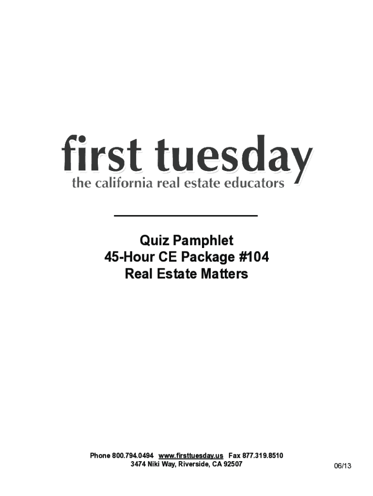 Quiz Pamphlet 45Hour CE Package #104 Real Estate MattersPhone 800.794.0494 www.firsttuesday.us Fax 877.319.8510 3474 Niki Way, Riverside, CA 9250706/13General Information first Tuesday ARE Sponsor