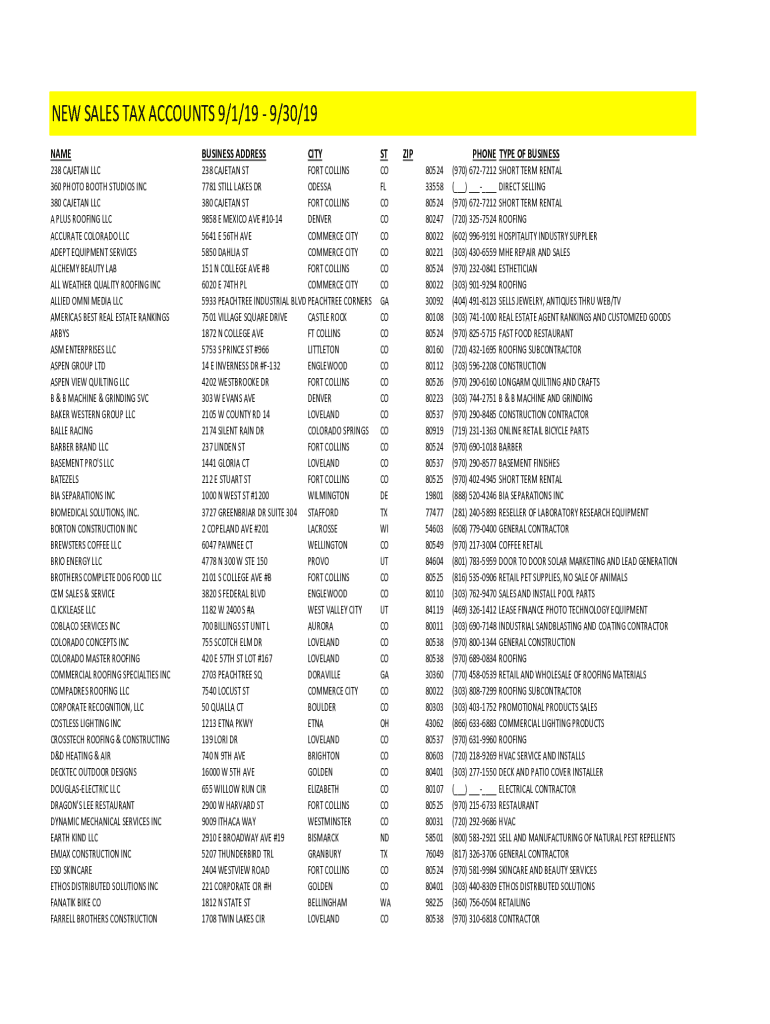 NEW SALES TAX ACCOUNTS 9/1/19 9/30/19 NAME238 CRETAN LLC 360 PHOTO BOOTH STUDIOS INC 380 CRETAN LLC A PLUS ROOFING LLC ACCURATE COLORADO LLC ADEPT EQUIPMENT SERVICES ALCHEMY BEAUTY LAB ALL WEATHER