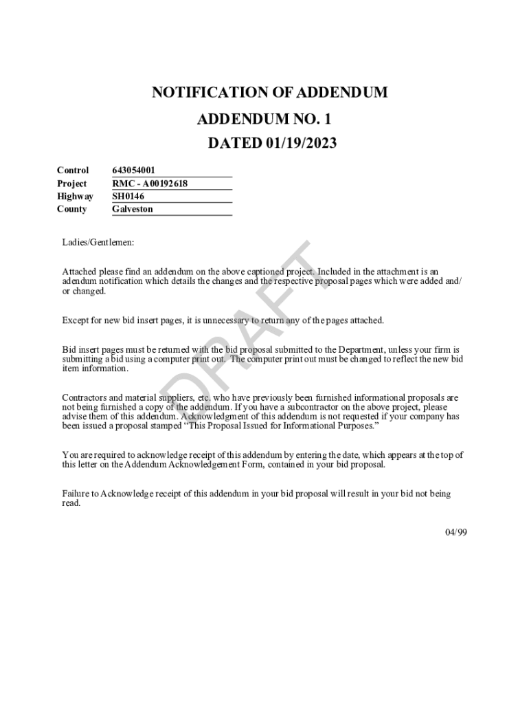 NOTIFICATION OF ADDENDUM NO. 1 DATED 01/19/2023 Control Project Highway County643054001 RMC A00192618 SH0146 GalvestonLadies/Gentlemen:Attached please find an addendum on the above captioned project.