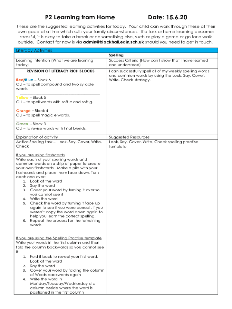 P2 Learning from Home Date: 15.6.20These are the suggested learning activities for today. Your child can work through these at their own pace at a time which suits your family circumstances. If a