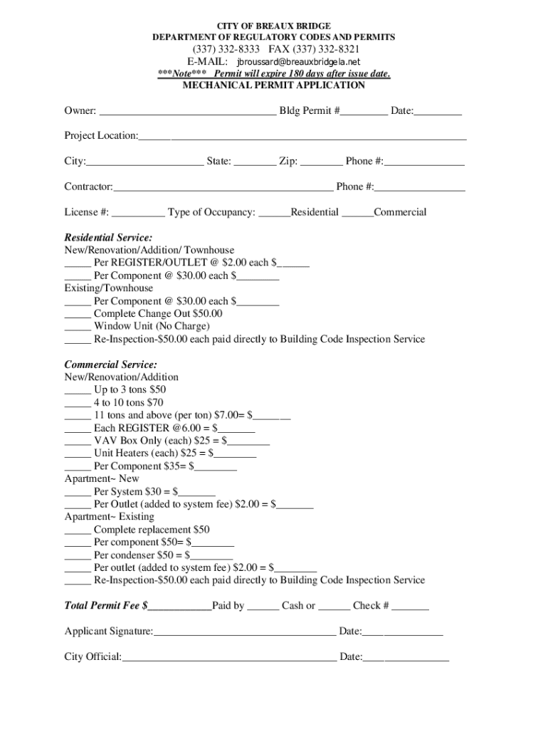 CITY OF BRE AUX BRIDGE DEPARTMENT OF REGULATORY CODES AND PERMITS(337) 3328333 FAX (337) 3328321 EMAIL: jbroussard@breauxbridgela.net ***Note*** Permit will expire 180 days after issue date. MECHANICAL