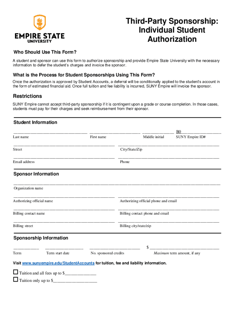 The Third-Party Sponsorship Authorization Form is a document used by students and sponsors to authorize sponsorship for tuition and fees at Empire State University.