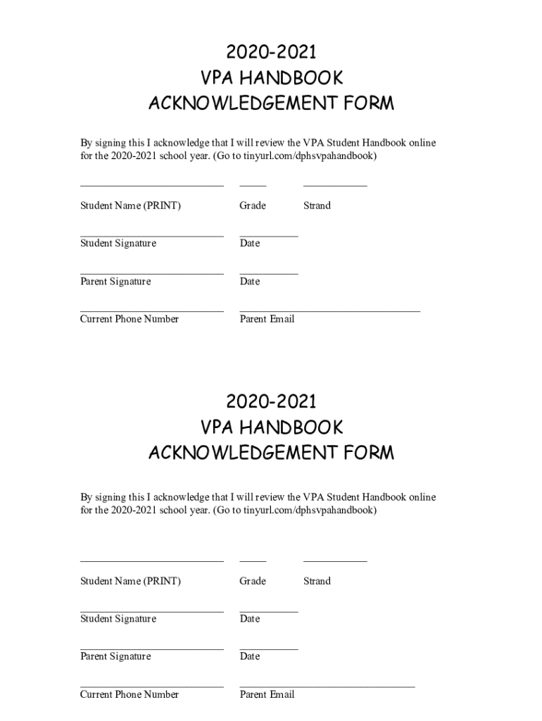 20202021 VIA HANDBOOK ACKNOWLEDGEMENT FORM By signing this I acknowledge that I will review the VIA Student Handbook online for the 20202021 school year. (Go to tinyurl.com/dphsvpahandbook) _________Student