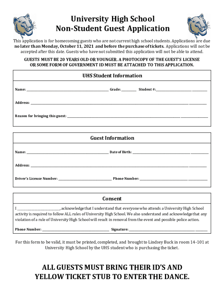 University High School Student Guest Application This application is for homecoming guests who are not current high school students. Applications are due no later than Monday, October 11, 2021, and