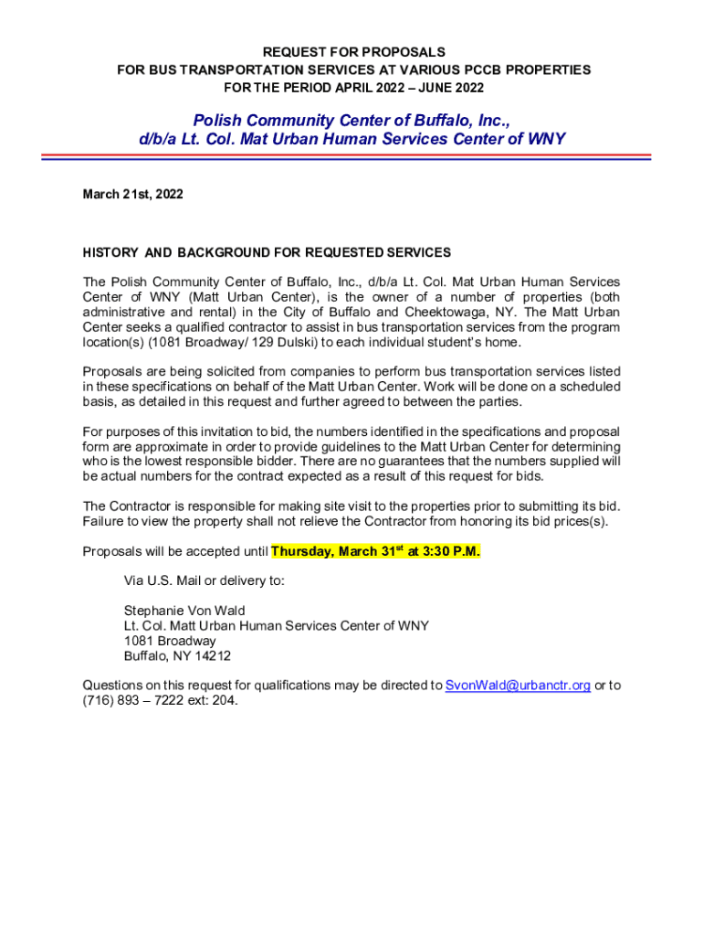 REQUEST FOR PROPOSALS FOR BUS TRANSPORTATION SERVICES AT VARIOUS PCB PROPERTIES FOR THE PERIOD APRIL 2022 JUNE 2022Polish Community Center of Buffalo, Inc., d/b/a Lt. Col. Mat Urban Human Services
