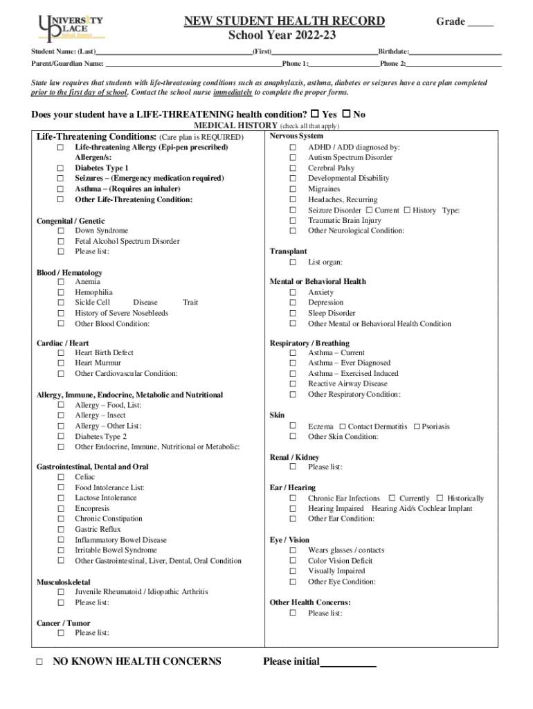 NEW STUDENT HEALTH RECORD School Year 202223 Student Name: (Last)(First)Parent/Guardian Name:Grade ___Birthdate: Phone 1:Phone 2:State law requires that students with life-threatening conditions such