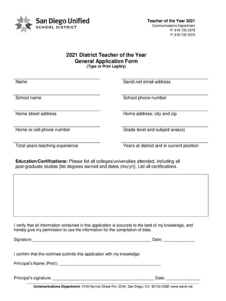 Teacher of the Year 2021 Communications Department P: 6197255578 F: 61972555762021 District Teacher of the Year General Application Form (Type or Print Legibly)Namesake.net email addressSchool homeschool