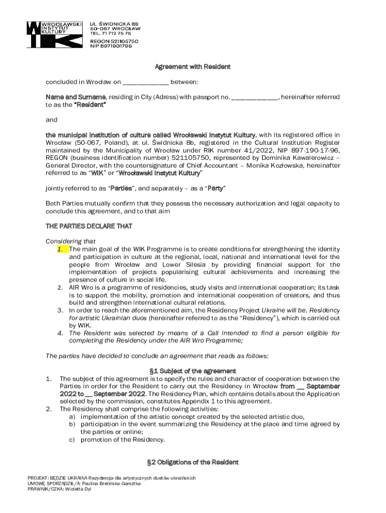 Agreement with Resident concluded in Wrocław on ___ between: Name and Surname, residing in City (Address) with passport no. ___, hereinafter referred to as the Resident and the municipal institution