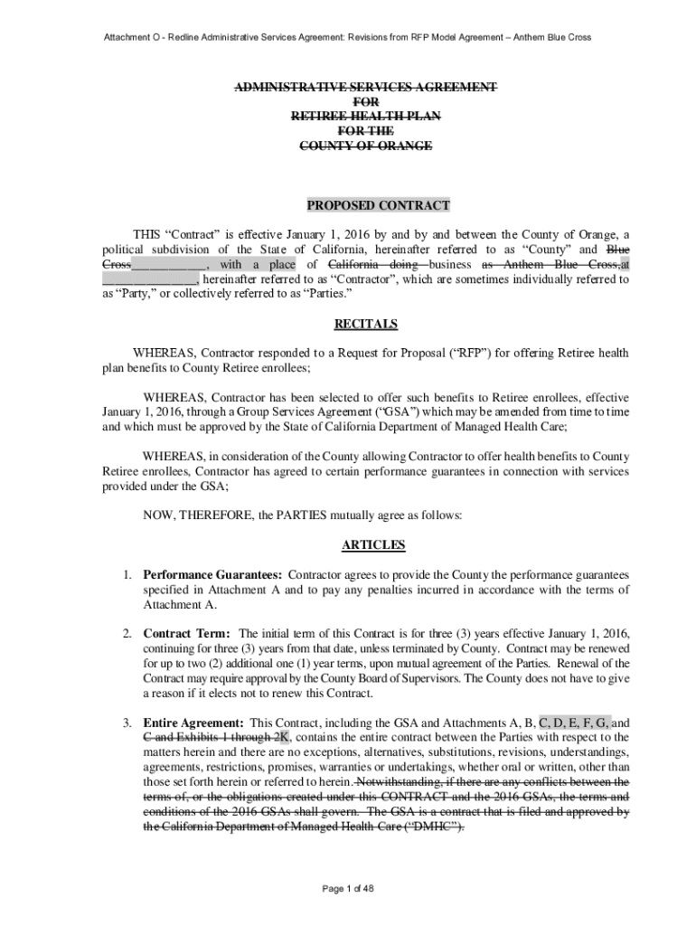 Attachment O Redline Administrative Services Agreement: Revisions from RFP Model Agreement Anthem Blue CrossADMINISTRATIVE SERVICES AGREEMENT FOR RETIREE HEALTH PLAN FOR THE COUNTY OF ORANGEPROPOSED