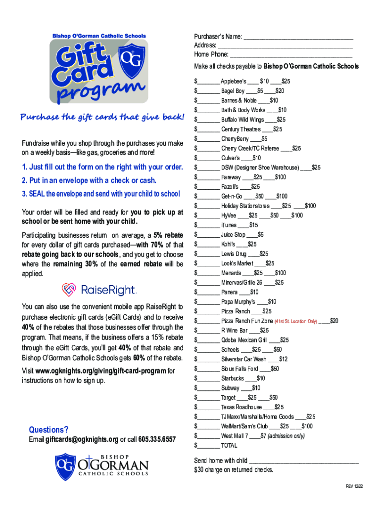 Purchasers Name: ___ Address: ___ Home Phone: ___ Make all checks payable to Bishop Gorman Catholic SchoolsFundraise while you shop through the purchases you make on a weekly basislike gas, groceries