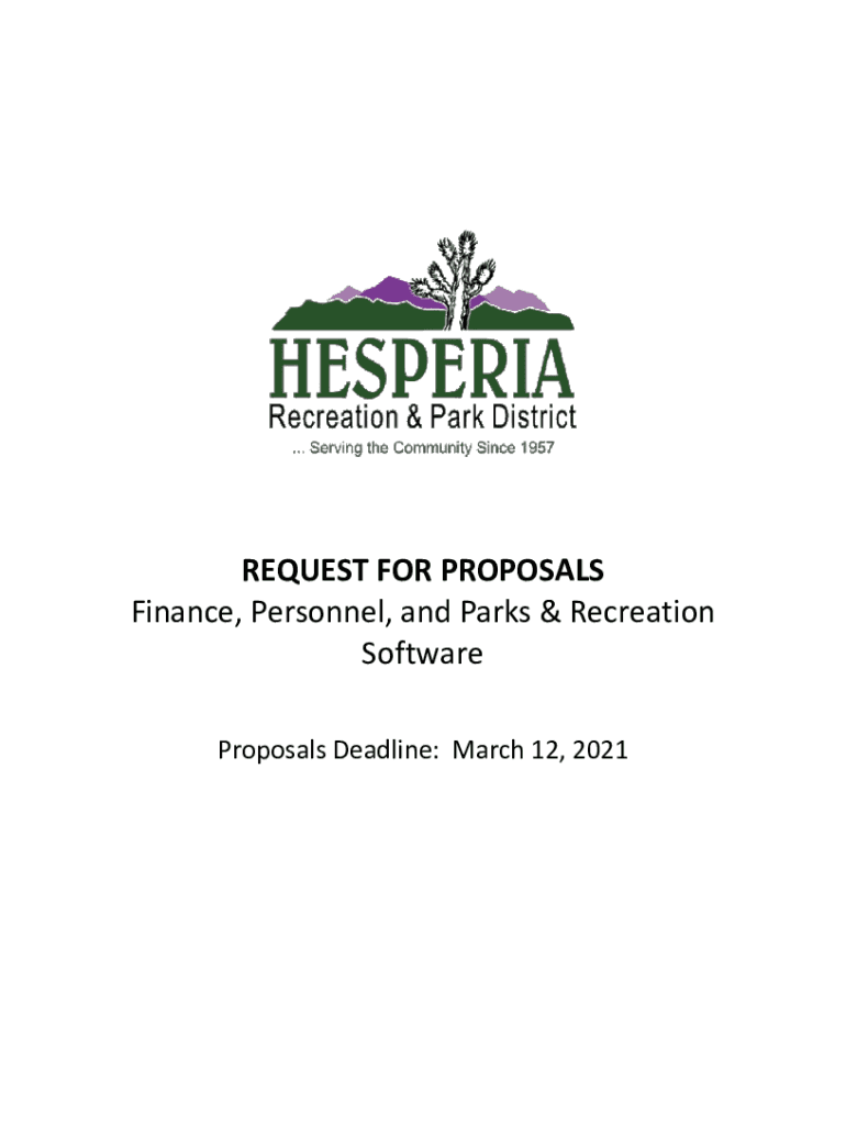 REQUEST FOR PROPOSALS Finance, Personnel, and Parks & Recreation Software Proposals Deadline: March 12, 2021Table of Contents INTRODUCTION 2 CALENDAR OF EVENTS 5 RESPONSE FORMAT 6 1.0Executive Summary