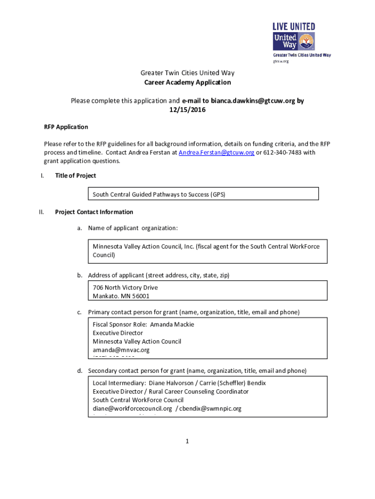 Greater Twin Cities United Way Career Academy Application Please complete this application and email to bianca.dawkins@gtcuw.org by 12/15/2016 RFP Application Please refer to the RFP guidelines for