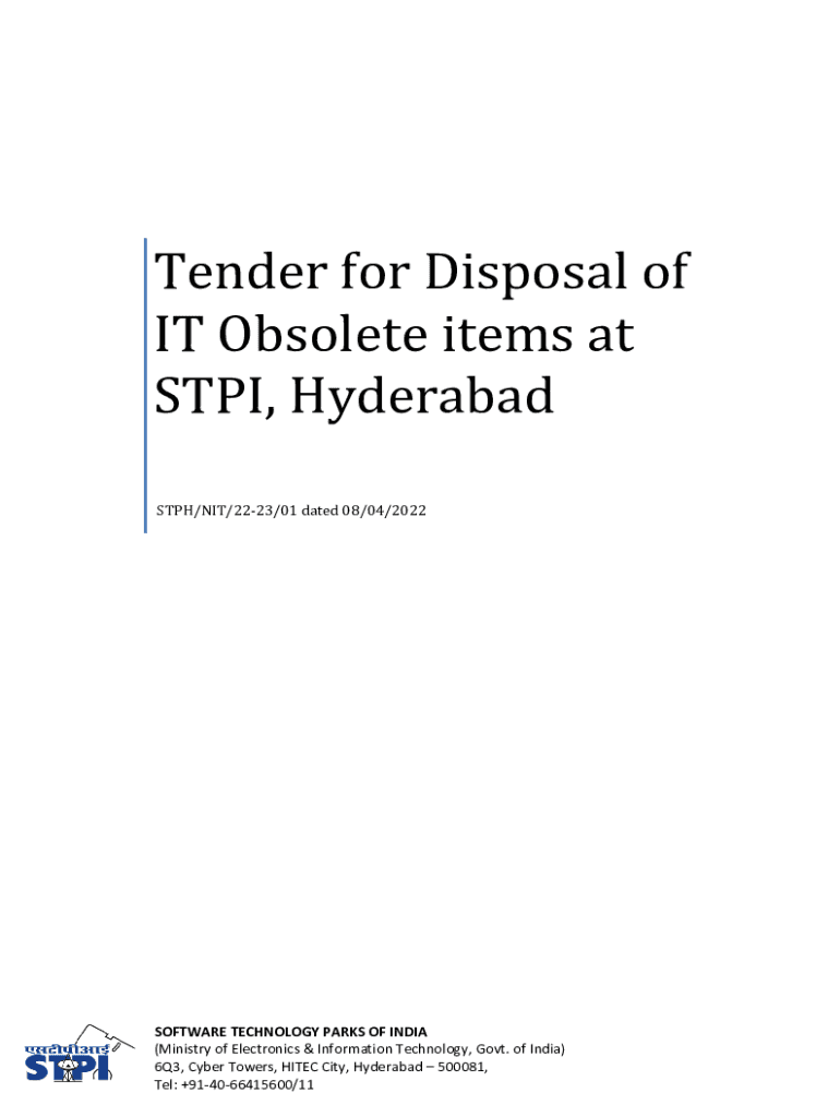 Tender for Disposal of IT Obsolete items at STP, Hyderabad STP/NIT/2223/01 dated 08/04/2022SOFTWARE TECHNOLOGY PARKS OF INDIA (Ministry of Electronics & Information Technology, Govt. of India) 6Q3,