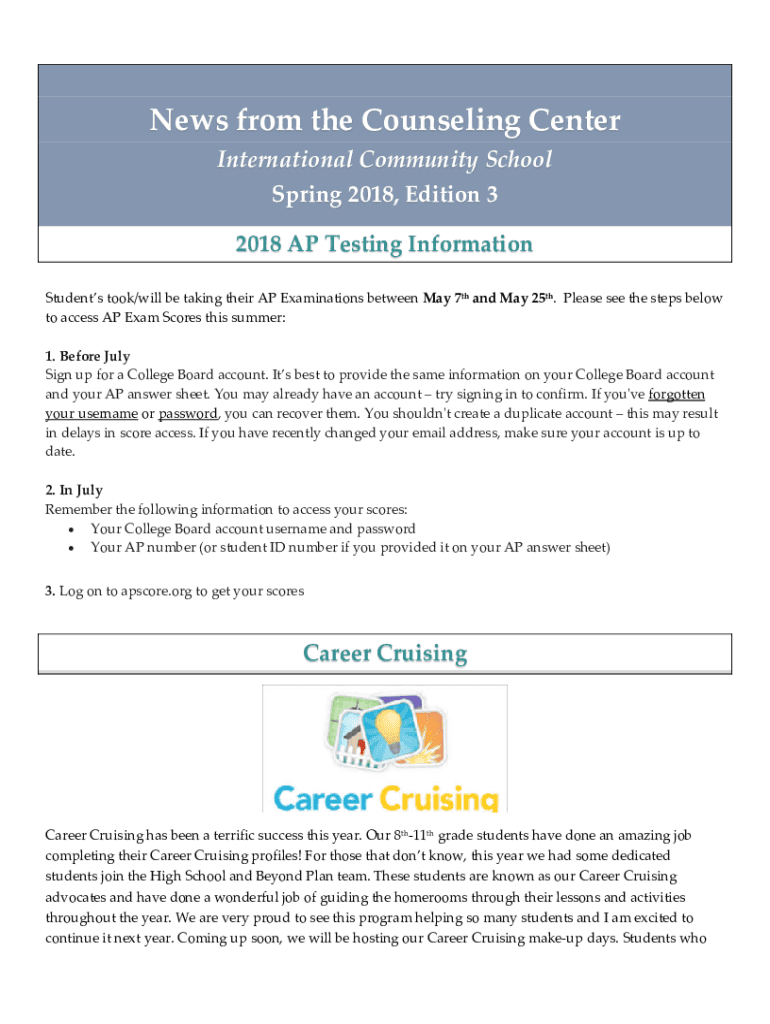 News from the Counseling Center International Community School Spring 2018, Edition 3 2018 AP Testing Information Students took/will be taking their AP Examinations between May 7th and May 25th. Please