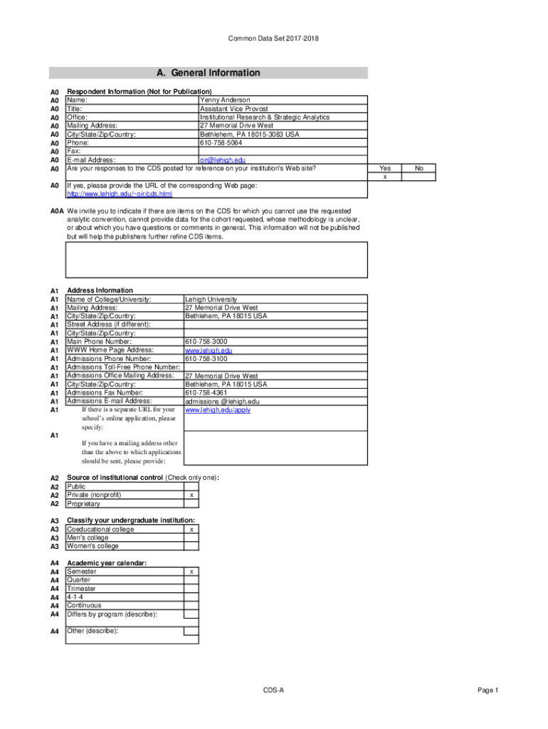 Common Data Set 20172018A. General Information A0 A0 A0 A0 A0 A0 A0 A0 A0 A0Respondent Information (Not for Publication) Name: Yenny Anderson Title: Assistant Vice Provost Office: Institutional Research
