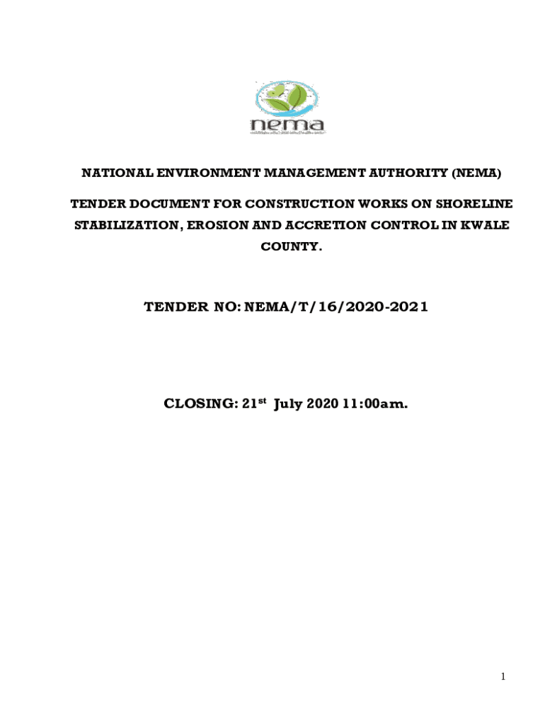 NATIONAL ENVIRONMENT MANAGEMENT AUTHORITY (NEA) TENDER DOCUMENT FOR CONSTRUCTION WORKS ON SHORELINE STABILIZATION, EROSION AND ACCRETION CONTROL IN KALE COUNTY.TENDER NO: NEA/T/16/20202021CLOSING: