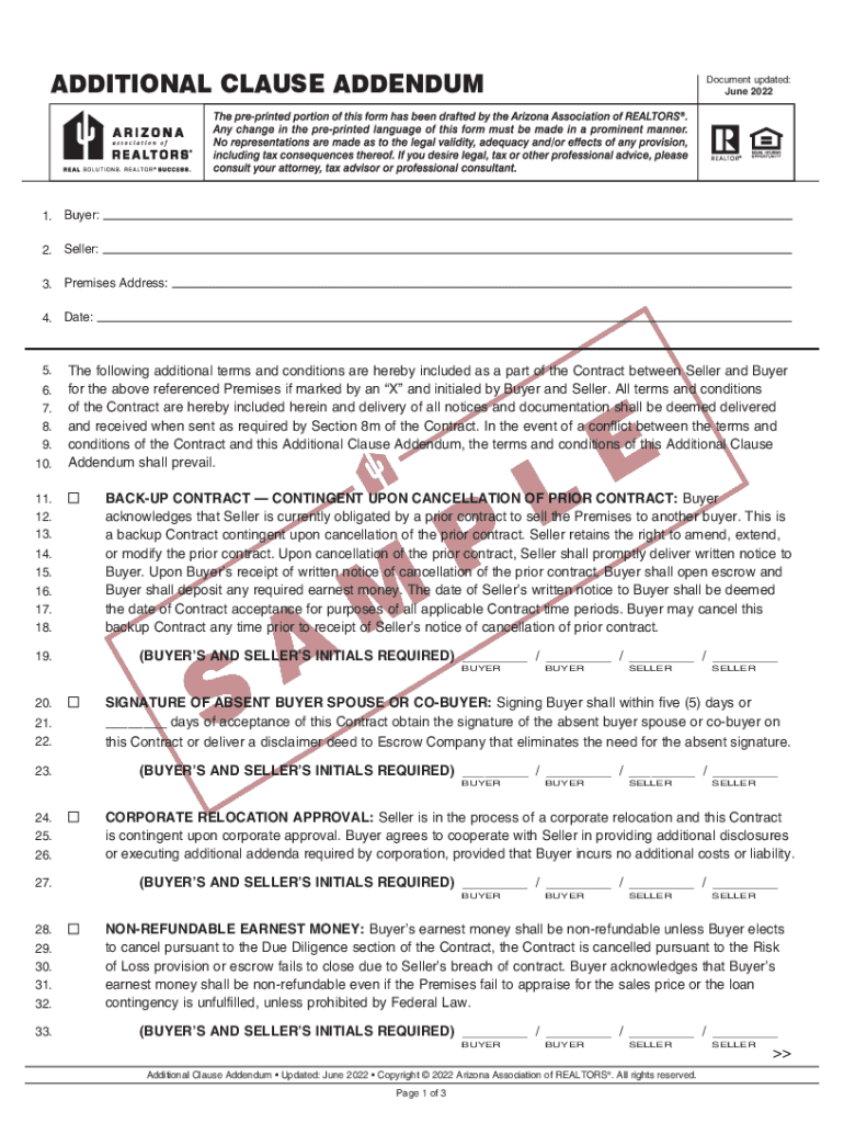 ADDITIONAL CLAUSE ADDENDUMDocument updated: June 20221. Buyer: 2. Seller: 3. Premises Address: 4. Date:5. 6. 7. 8. 9. 10. 11. 12. 13. The following additional terms and conditions are hereby included