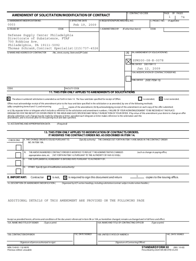 1. CONTRACT ID CODEPENDENT OF SOLICITATION/MODIFICATION OF CONTRACT 2. AMENDMENT/MODIFICATION NO.3. EFFECTIVE DATE0003PAGEOF PAGES14. REQUISITION/PURCHASE REQ. NO.5. PROJECT NO.7. ADMINISTERED BYCODE74(If