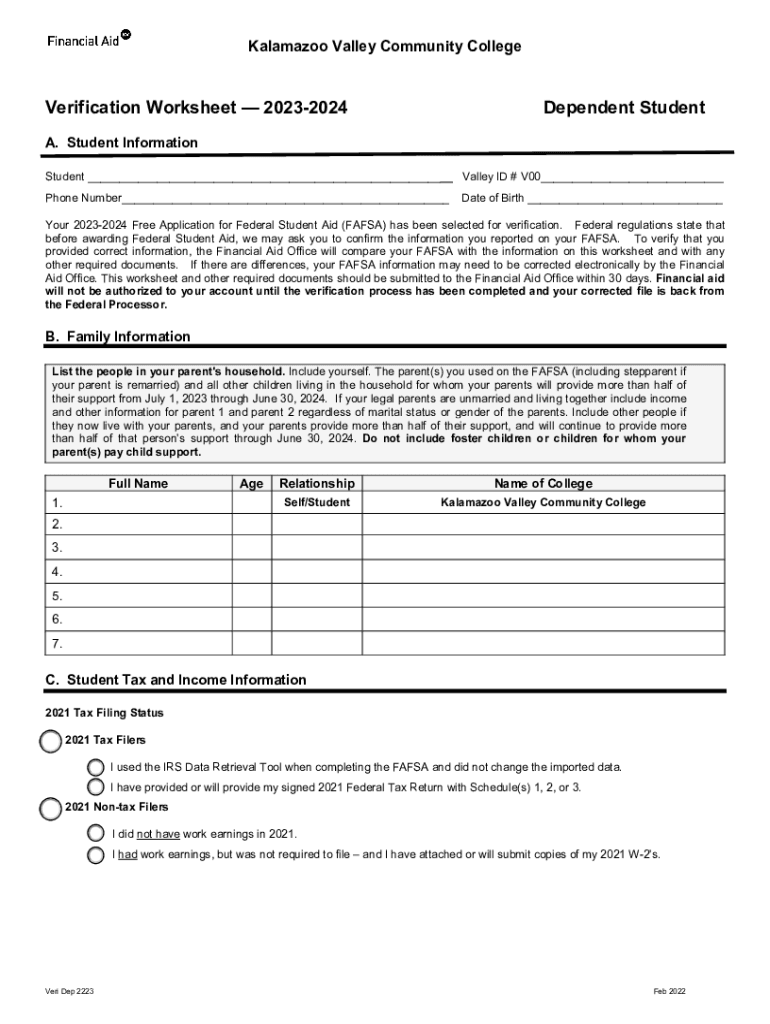 Kalamazoo Valley Community CollegeVerification Worksheet 20232024Dependent Students. Student Information Student ___Valley ID # V00___Phone Number___Date of Birth ___Your 20232024 Free Application