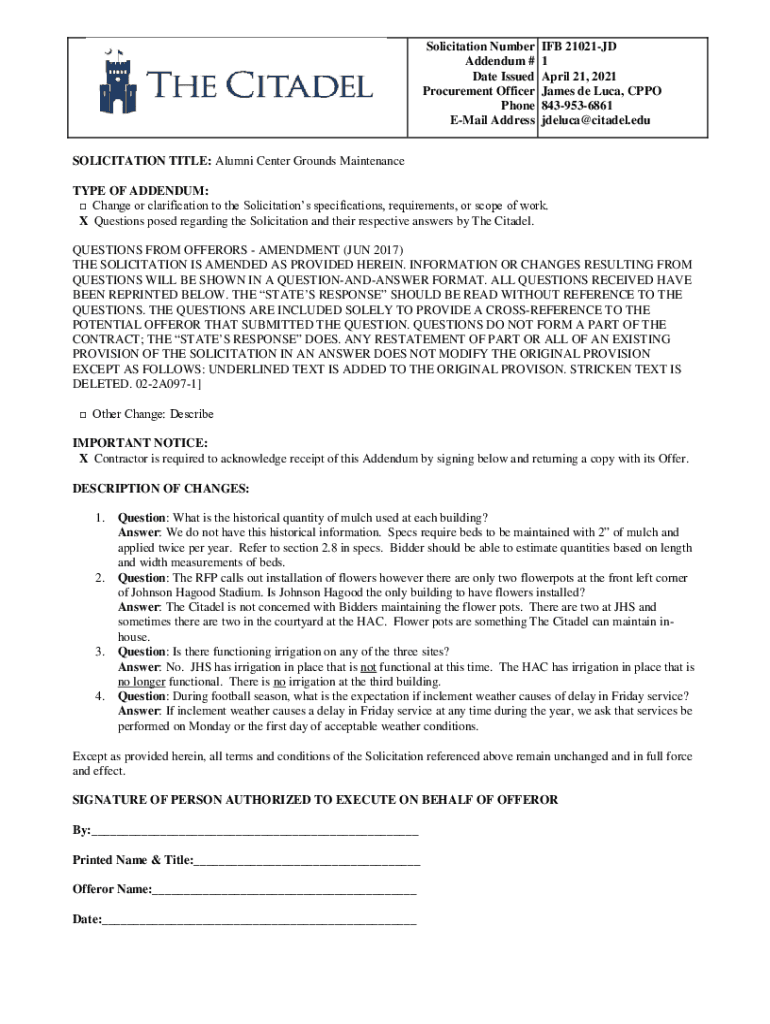 Solicitation Number Addendum # Date Issued Procurement Officer Phone Email Addressing 21021JD 1 April 21, 2021, James de Luca, CAPO 8439536861 jdeluca@citadel.eduSOLICITATION TITLE: Alumni Center