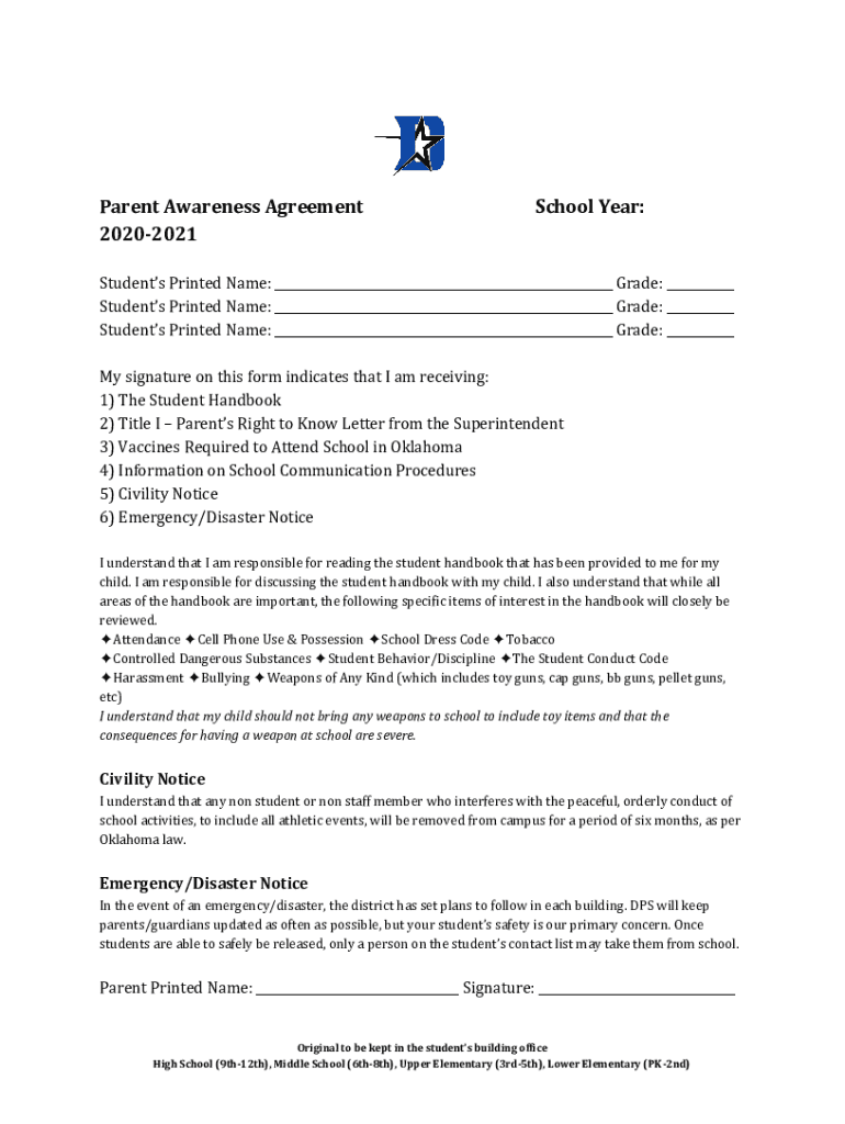 Parent Awareness Agreement 20202021School Year:Students Printed Name: ___ Grade: ___ Students Printed Name: ___ Grade: ___ Students Printed Name: ___ Grade: ___ My signature on this form indicates