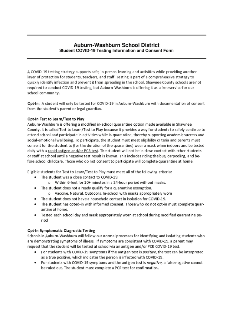 Student COVID-19 Testing Information and Consent Form COVID-19 testing strategy supports safe, unperson learning and activities while providing another