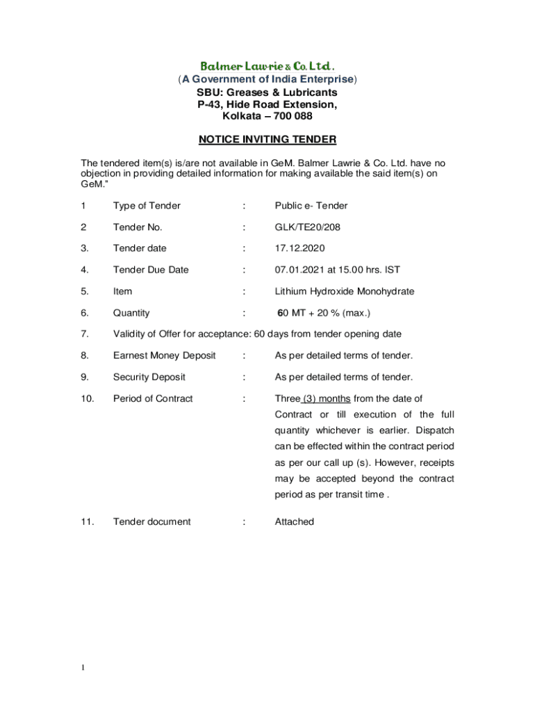 (A Government of India Enterprise) SBS: Greases & Lubricants P43, Hide Road Extension, Kolkata 700 088 NOTICE INVITING TENDER The tendered item(s) is/are not available in Gem. Palmer Laurie & Co.