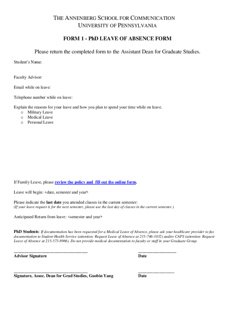 Get the free PhD LEAVE OF ABSENCE FORM Please return the ...