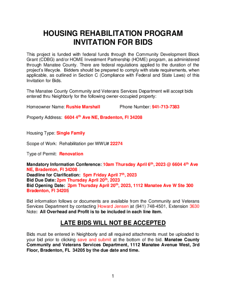 HOUSING REHABILITATION PROGRAM INVITATION FOR BIDS This project is funded with federal funds through the Community Development Block Grant (CBG) and/or HOME Investment Partnership (HOME) program,
