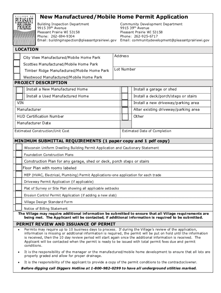 New Manufactured/Mobile Home Permit Application Building Inspection Department 9915 39th Avenue Pleasant Prairie WI 53158 Phone: 2626949304 Email: buildinginspection@pleasantprairiewi.govCommunity