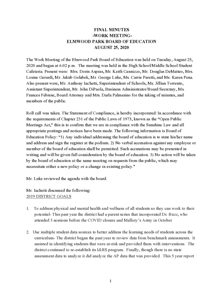 FINAL MINUTES WORK MEETINGELMWOOD PARK BOARD OF EDUCATION AUGUST 25, 2020, The Work Meeting of the Elmwood Park Board of Education was held on Tuesday, August 25, 2020, and began at 6:02 p.m. The