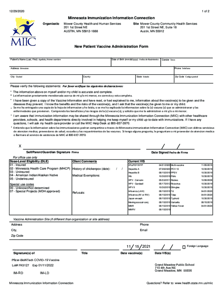 12/29/20201 of 2Minnesota Immunization Information Connection OrganizatioMower County Health and Human Services 201 1st Street NE AUSTIN, MN 559121888Site Mower County Community Health Services 201