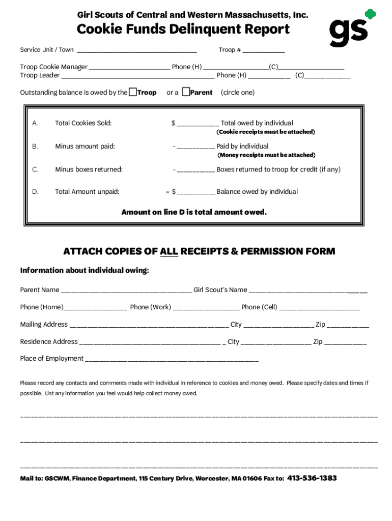 Girl Scouts of Central and Western Massachusetts, Inc. Cookie Funds Delinquent Report Service Unit / Town ___Troop # ___Troop Cookie Manager ___ ___ Phone (H) ___ ___ (C)___ ___ Troop Leader ___ Phone