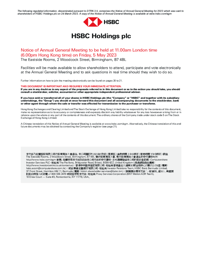 HSBC Holdings plc Notice of Annual General Meeting to be held at 11.00am London time (6.00pm Hong Kong time) on Friday, 5 May 2023 The Eastside Rooms, 2 Woodcock Street, Birmingham, B7 4BLFacilities