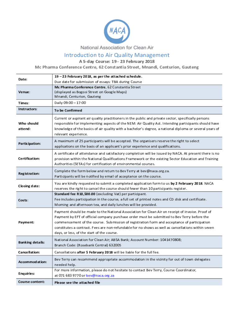 Introduction to Air Quality Management A 5day Course: 19 23 February 2018 MC Pharma Conference Center, 62 Constancia Street, Mandy, Centurion, Gluten Date: Venue:19 23 February 2018, as per the attached