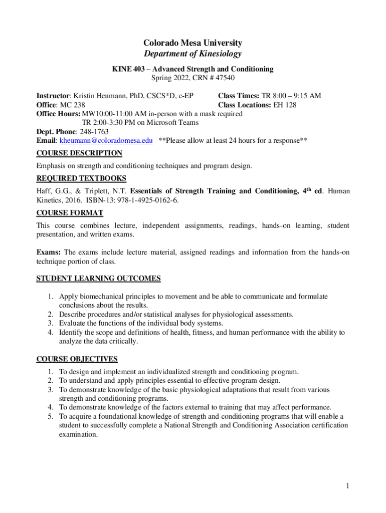 Colorado Mesa University Department of Kinesiology KINE 403 Advanced Strength and Conditioning Spring 2022, CRN # 47540 Instructor: Kristin Hermann, PhD, CSS’D, CEP Class Times: TR 8:00 9:15 AM