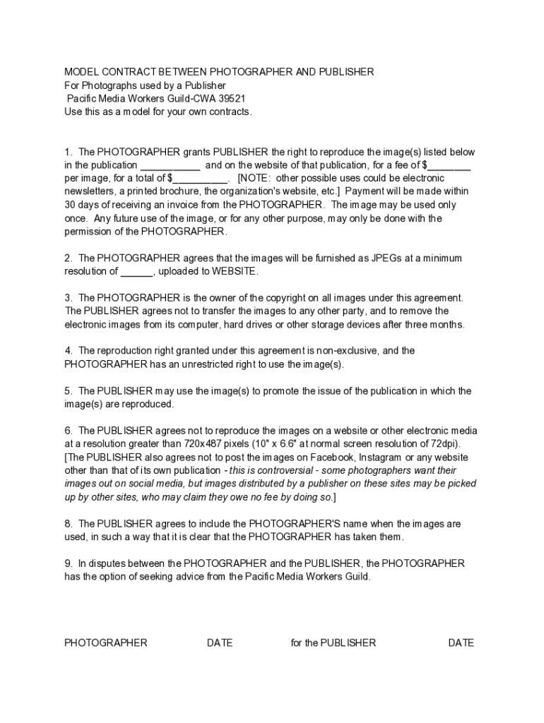 MODEL CONTRACT BETWEEN PHOTOGRAPHER AND PUBLISHER For Photographs used by a Publisher Pacific Media Workers Guild CWA 39521 Use this as a model for your own contracts.1. The PHOTOGRAPHER grants PUBLISHER