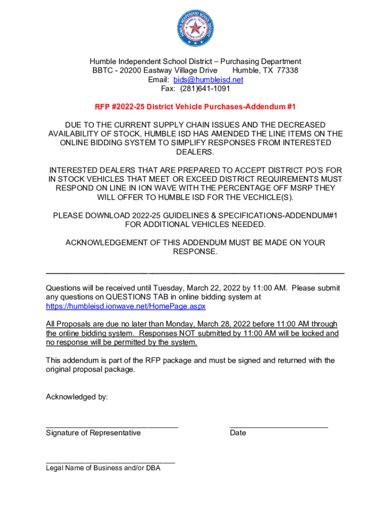 Humble Independent School District Purchasing Department BBC 20200 East way Village Drive Humble, TX 77338 Email: bids@humbleisd.net Fax: (281)6411091 RFP #202225 District Vehicle PurchasesAddendum