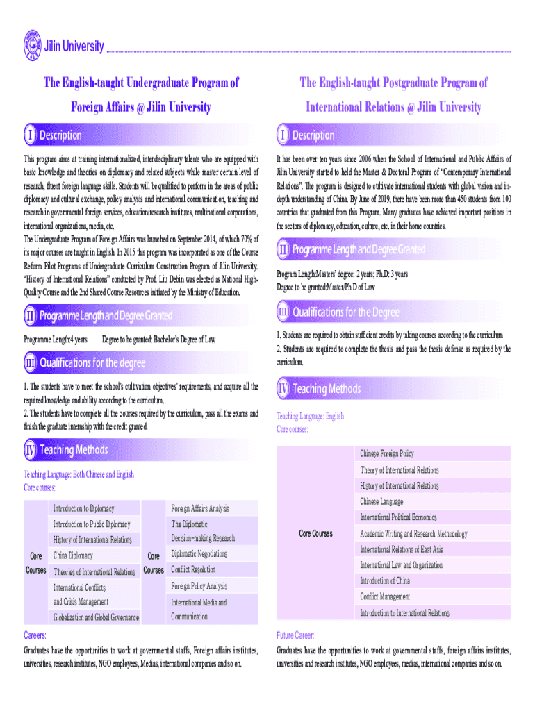 Jilin UniversityIThe English taught Undergraduate Program the English taught Postgraduate Program foreign Affairs @ Jilin UniversityInternational Relations @ Jilin University IDescriptionThis program