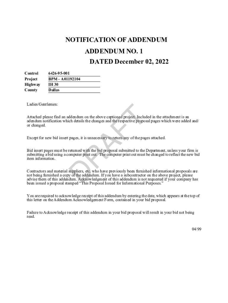 NOTIFICATION OF ADDENDUM NO. 1 DATED December 02, 2022, Control Project Highway County642695001 BPM A01192104 IH 30 Salesladies/Gentlemen:Attached please find an addendum on the above captioned project.