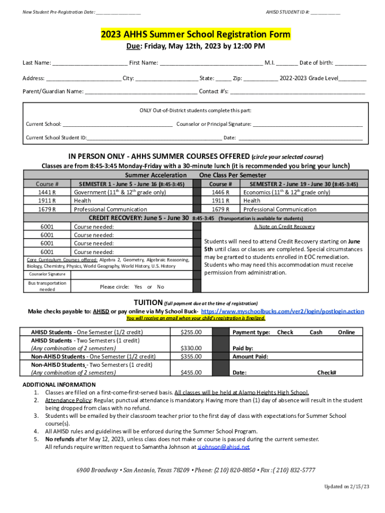 New Student Preregistration Date: ___AH ISD STUDENT ID #: ___2023 AHS Summer School Registration Form Due: Friday, May 12th, 2023 by 12:00 PM Last Name: ___ First Name: ___ M.I. ___ Date of birth: