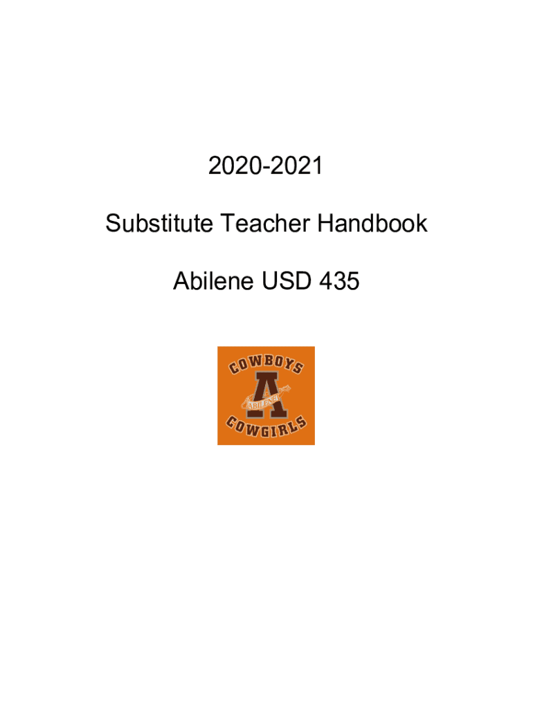 20202021 Substitute Teacher Handbook Abilene USD 435Table of Contents 1.0 Guiding Statements Preface Abilene USD 435 Substitute Teacher Policy Abilene USD 435 Guiding Documents: Mission Statement