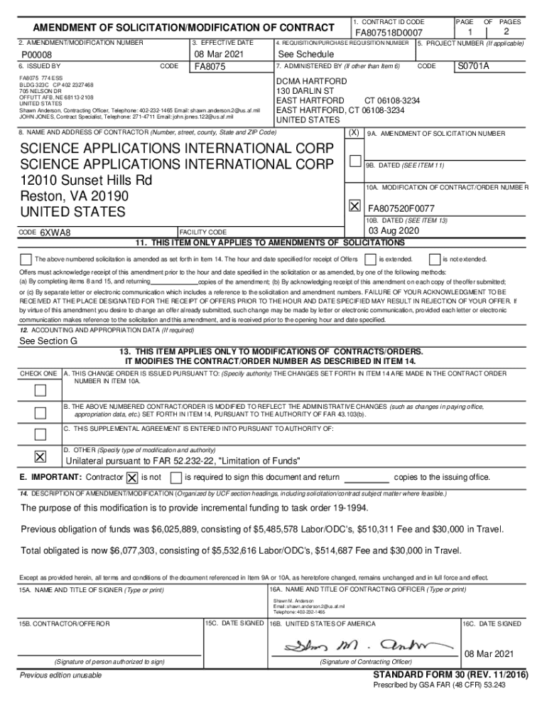AMENDMENT OF SOLICITATION/MODIFICATION OF CONTRACT 2. AMENDMENT/MODIFICATION NUMBER3. EFFECTIVE DATE08 Mar 2021 FA8075P00008 6. ISSUED BYCODE1. CONTRACT ID CODEPAGEFA807518D000714. REQUISITION/PURCHASE