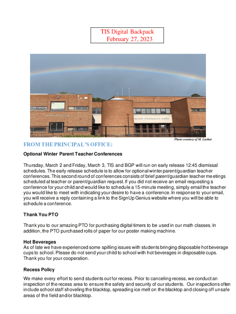 TIS Digital Backpack February 27, 2023Photo courtesy of M. LachutFROM THE PRINCIPALS OFFICE: Optional Winter Parent Teacher Conferences Thursday, March 2 and Friday, March 3, TIS and BGP will run