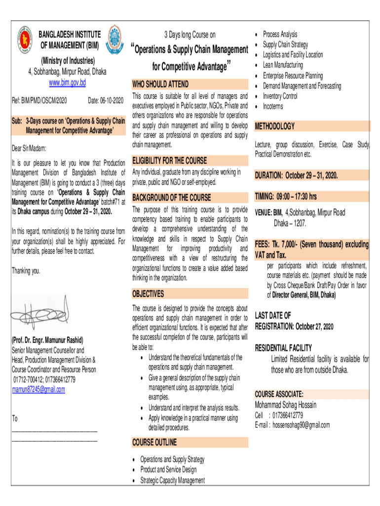 BANGLADESH INSTITUTE OF MANAGEMENT (BIM) (Ministry of Industries) 4, Beanbag, Mirror Road, Dhaka www.bim.gov.bd Ref: BIM/PMD/ISCM/2020Date: 06102020Sub: 3Days course on Operations & Supply Chain Management