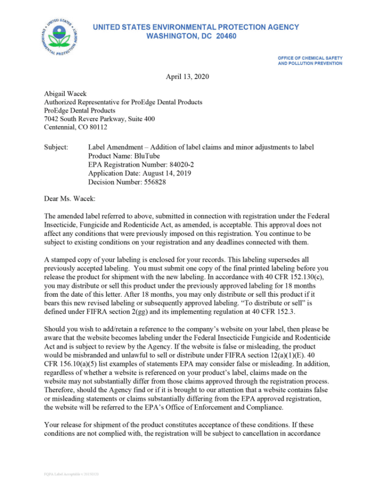 UNITED STATES ENVIRONMENTAL PROTECTION AGENCY WASHINGTON, DC 20460 OFFICE OF CHEMICAL SAFETY AND POLLUTION PREVENTION April 13, 2020, Abigail Wack Authorized Representative for Pledge Dental Products