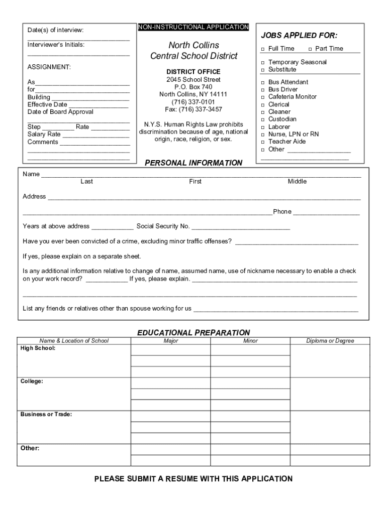 Date(s) of interview: ___ Interviewers Initials: ___INSTRUCTIONAL APPLICATION North Collins Central School DistrictASSIGNMENT: As___ for___ Building ___ Effective Date ___ Date of Board Approval ___