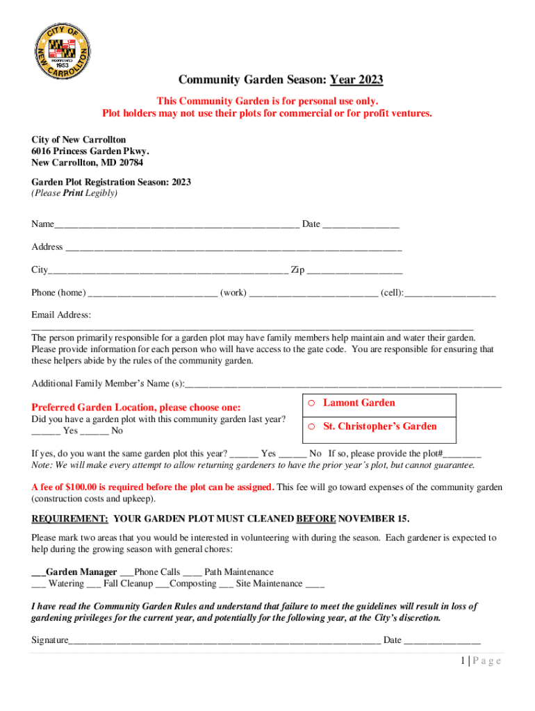 Community Garden Season: Year 2023 This Community Garden is for personal use only. Plot holders may not use their plots for commercial or for profit ventures. City of New Carrollton 6016 Princess