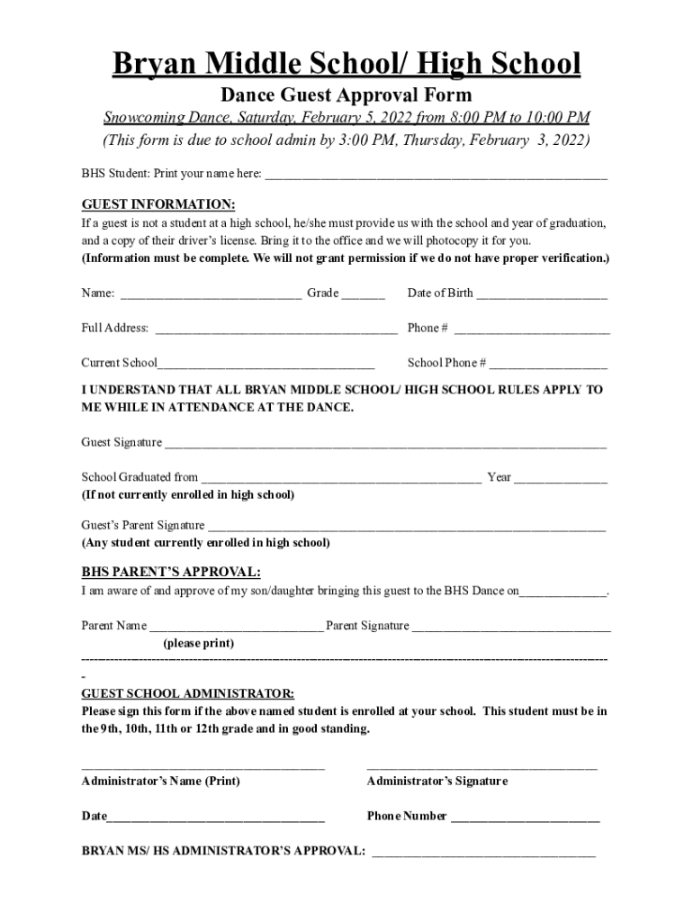 Bryan Middle School/ High School Dance Guest Approval Form Snow coming Dance, Saturday, February 5, 2022, from 8:00 PM to 10:00 PM (This form is due to school admin by 3:00 PM, Thursday, February