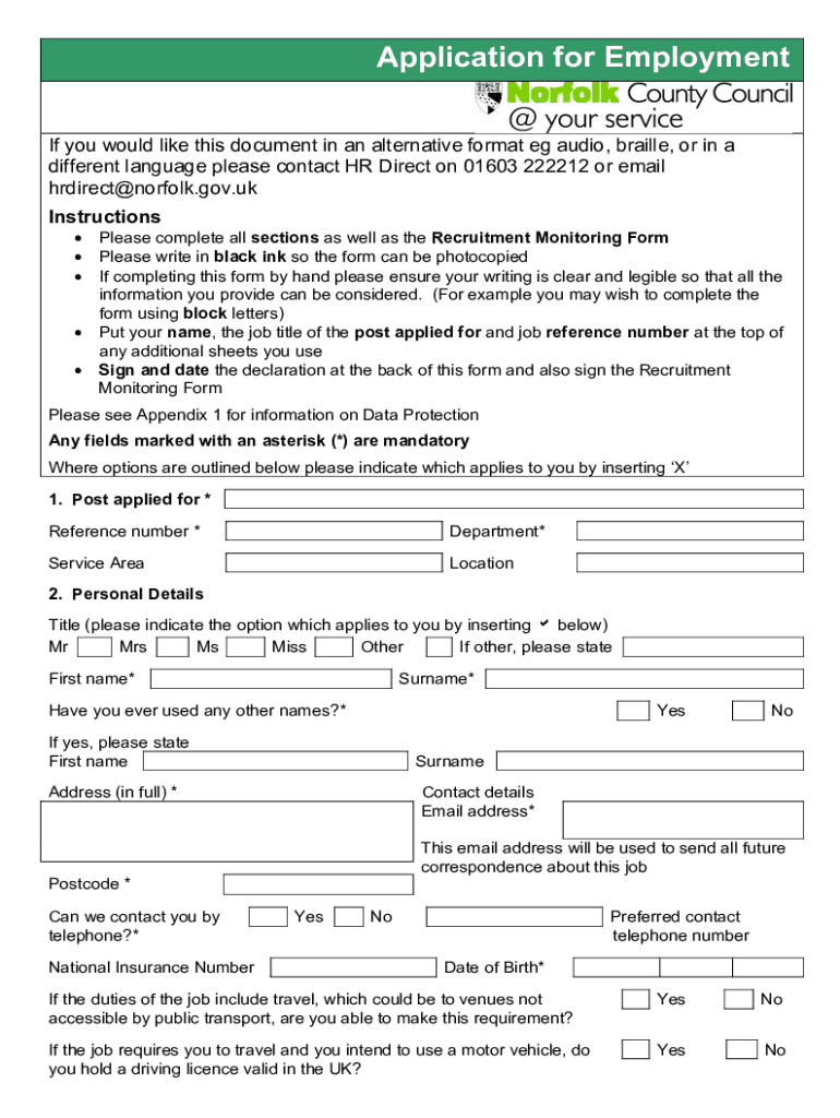 Application for Employment If you would like this document in an alternative format e.g. audio, braille, or in a different language please contact HR Direct on 01603 222212 or email hrdirect@norfolk.gov.uk